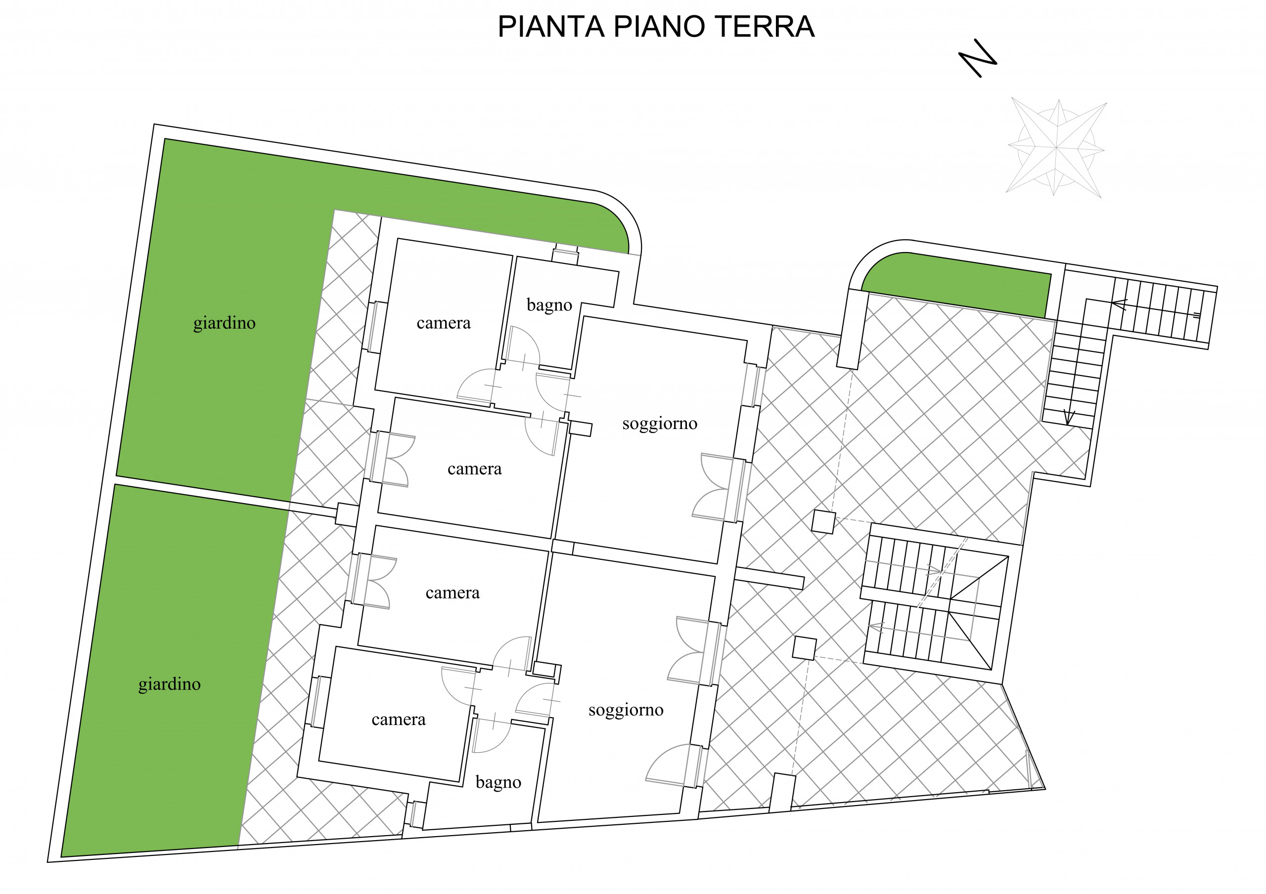 Appartamento al piano terra con ingresso indipendente, della superficie di circa 61,5 mq, composto da soggiorno con angolo cottura, due camere da letto (una matrimoniale e una doppia) e un bagno con box doccia.