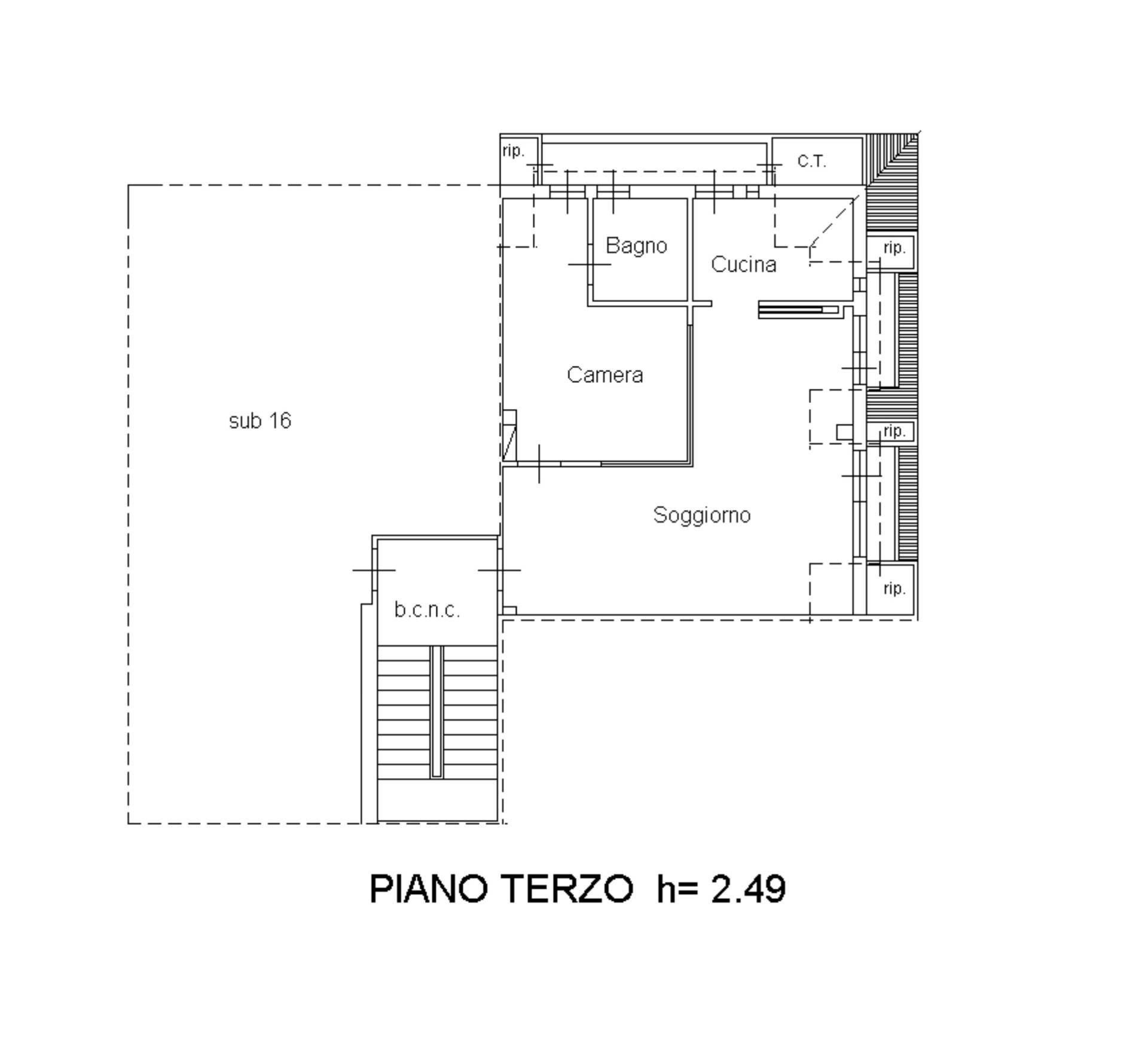Appartamento mansardato ad uso civile abitazione, posto al terzo piano senza ascensore, della superficie di circa 57 mq. L'ingresso si apre su un accogliente soggiorno con camino, affiancato da una cucina semi abitabile; la zona notte è composta da una camera matrimoniale e da un bagno finestrato con doccia. La proprietà é fornita di tre piccoli balconi, per una superficie complessiva di circa 3 mq. Completa la proprietà una piccola cantina al piano terra privata (in regalo), oltre ad una zona comune retrostante per la rimessa di biciclette.